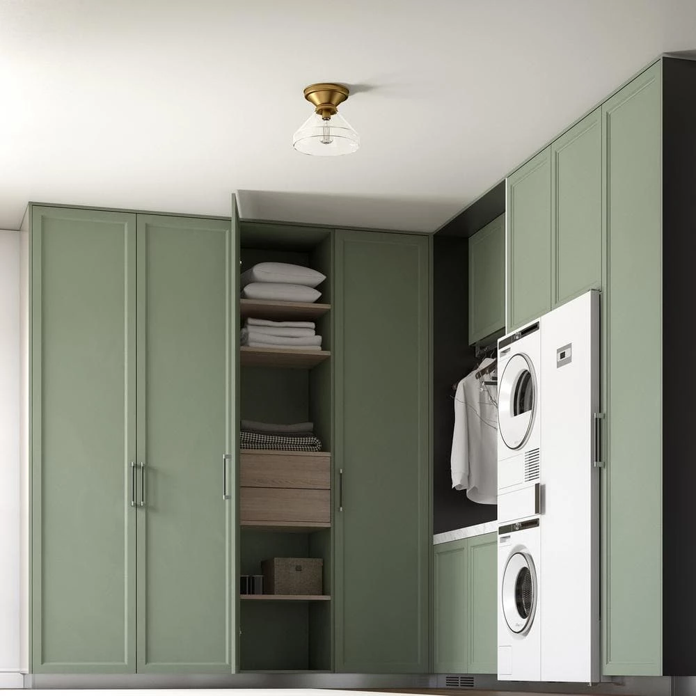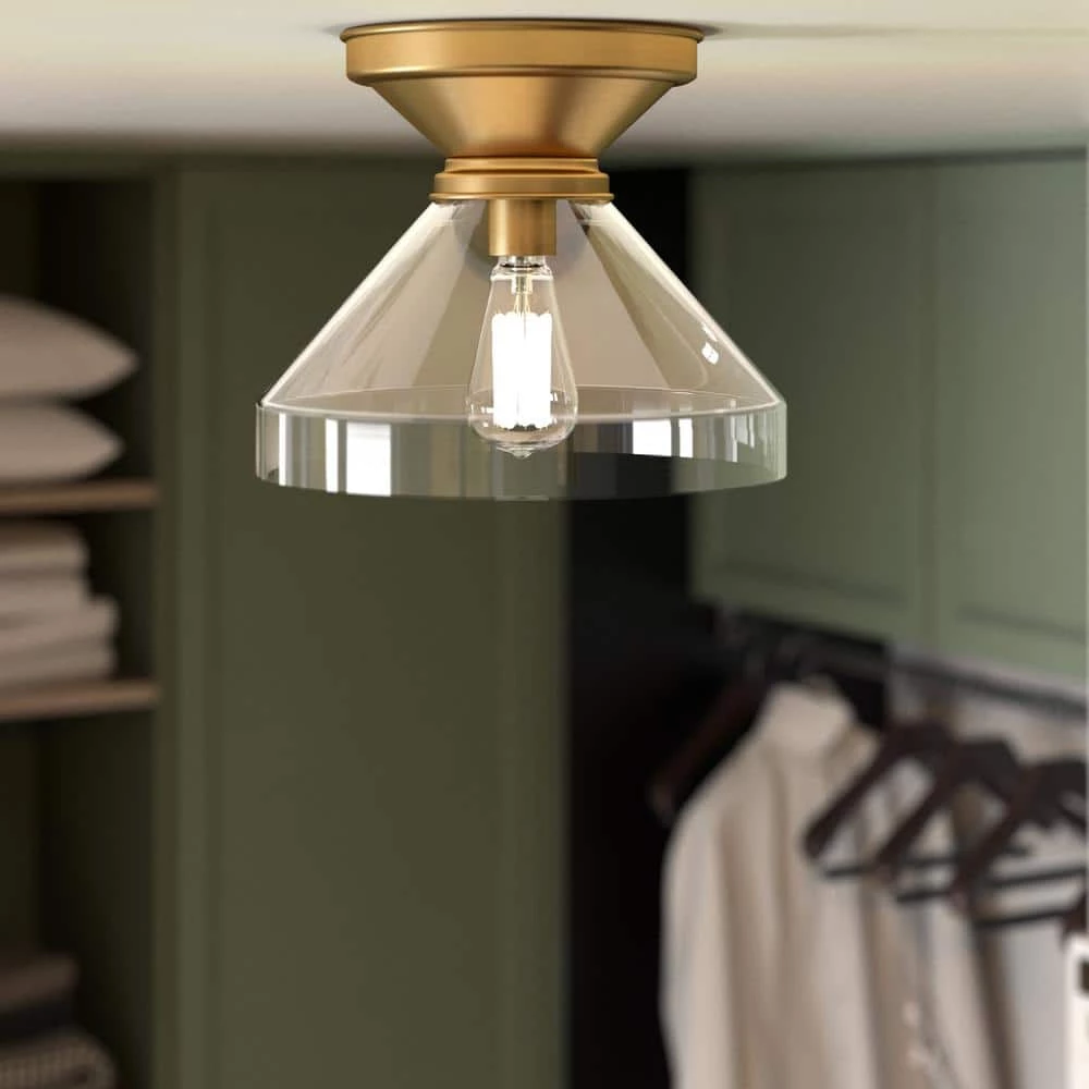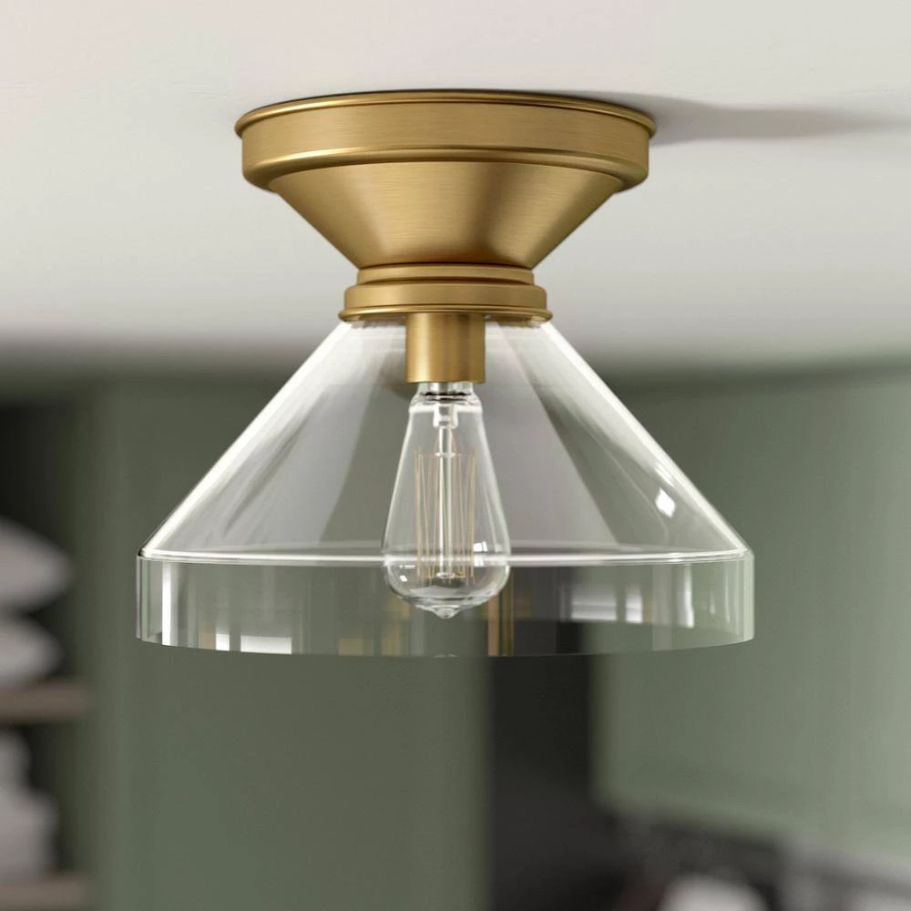 Pairing a traditional canopy with a modern bell-shaped shade, this flush mount ceiling light creates a simple and clean look in your entranceway, hallway, or dining room. The clear glass shade showcases the bulb of your choice – try a vintage-style Edison bulb for effortless retro styling. The transitional style lets this fixture blend in or stand out in many decor styles and color schemes.