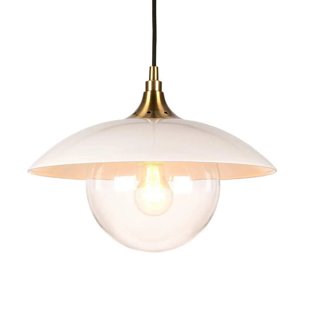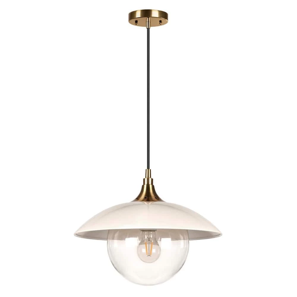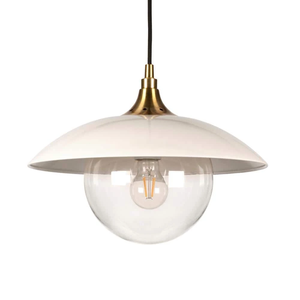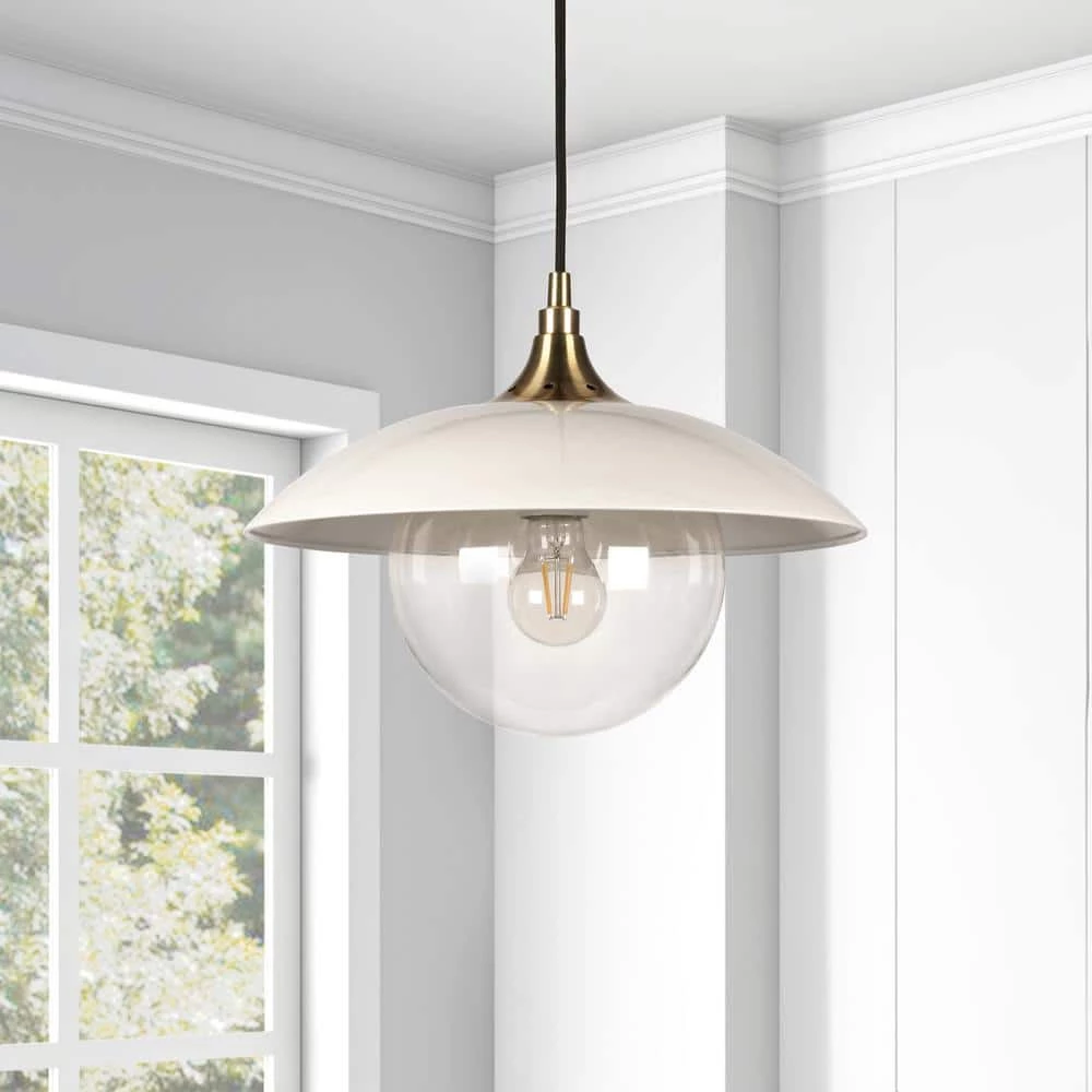 - Shade is made from metal and finished in a pearled white with hardware in a brass finish