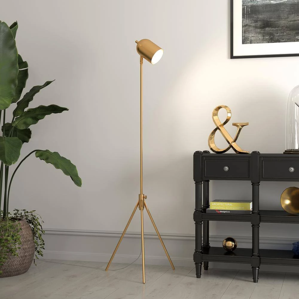 Infuse your space with a editorial feel with the addition of this modern tripod floor lamp. Inspired by studio lighting, this fixture features an adjustable center pole and is finished in your choice of neutral metallic tones. Create an easy designer look in your bedroom, living room or workspace.