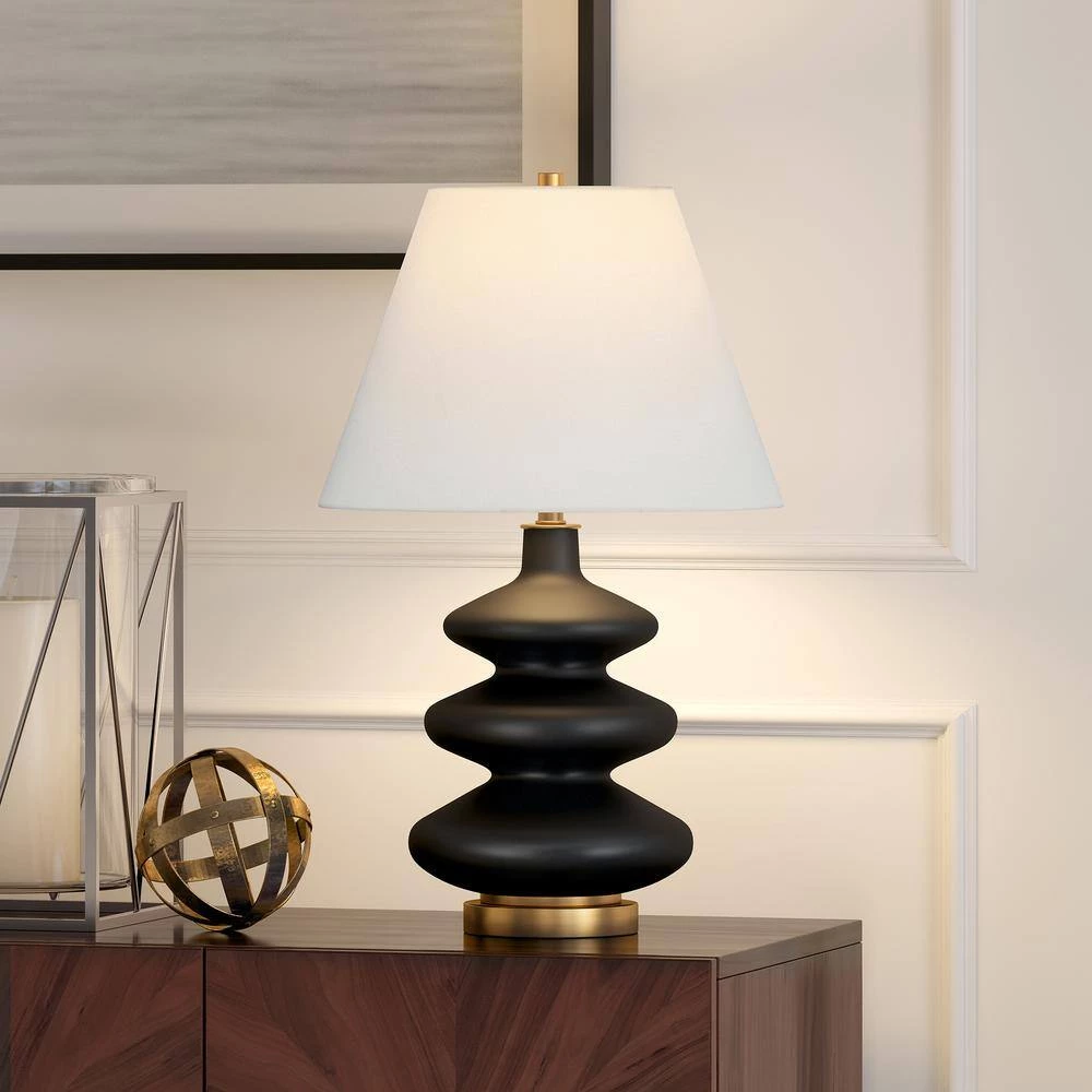 This contemporary table lamp features a triple gourd base made of glass. The body is finished with a matte exterior and is topped off with a white linen empire shade. The body and shade complement the soft curves featured in the design.