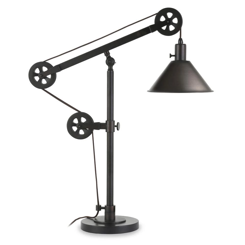This blackened bronze table lamp counterbalances function and design. It features an adjustable pulley system allowing you to personalize your space. The industrial style creates this piece to be the center of attention in any room.