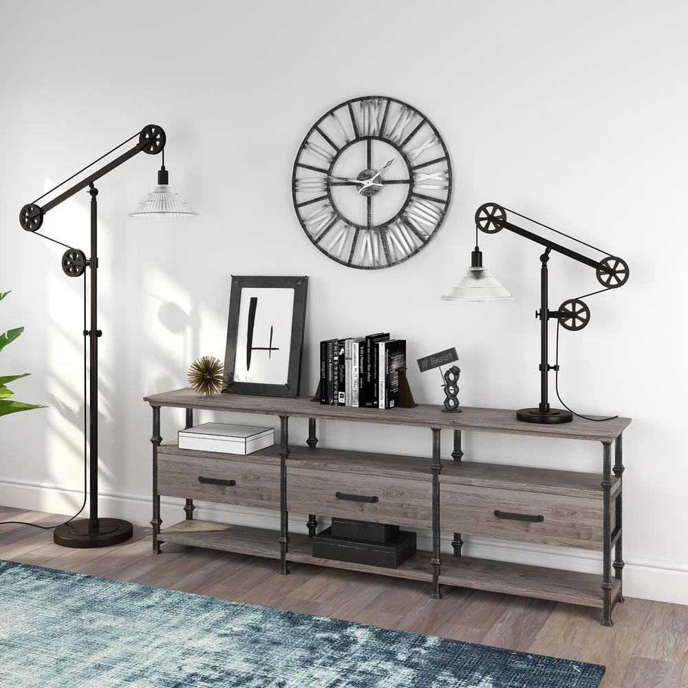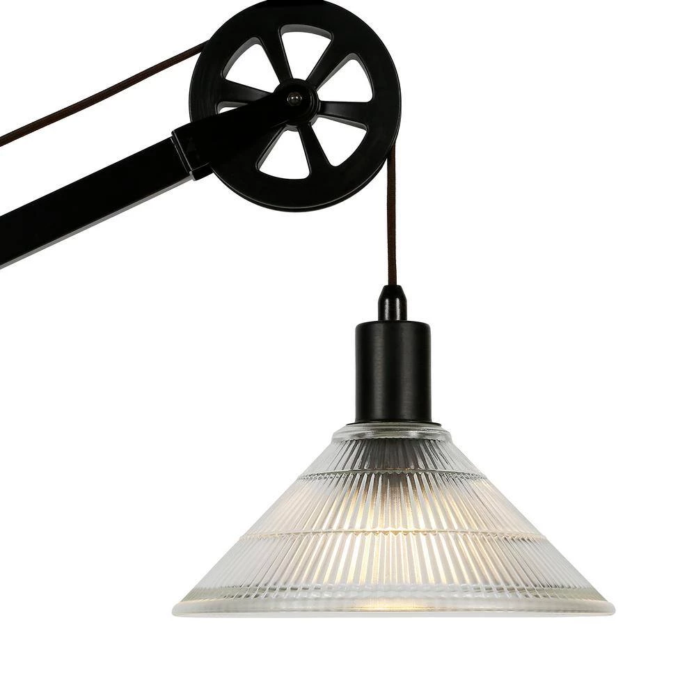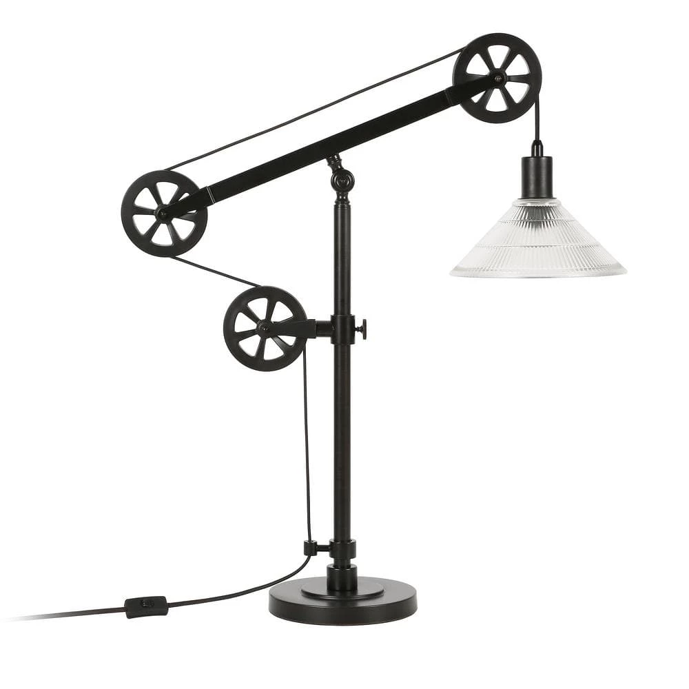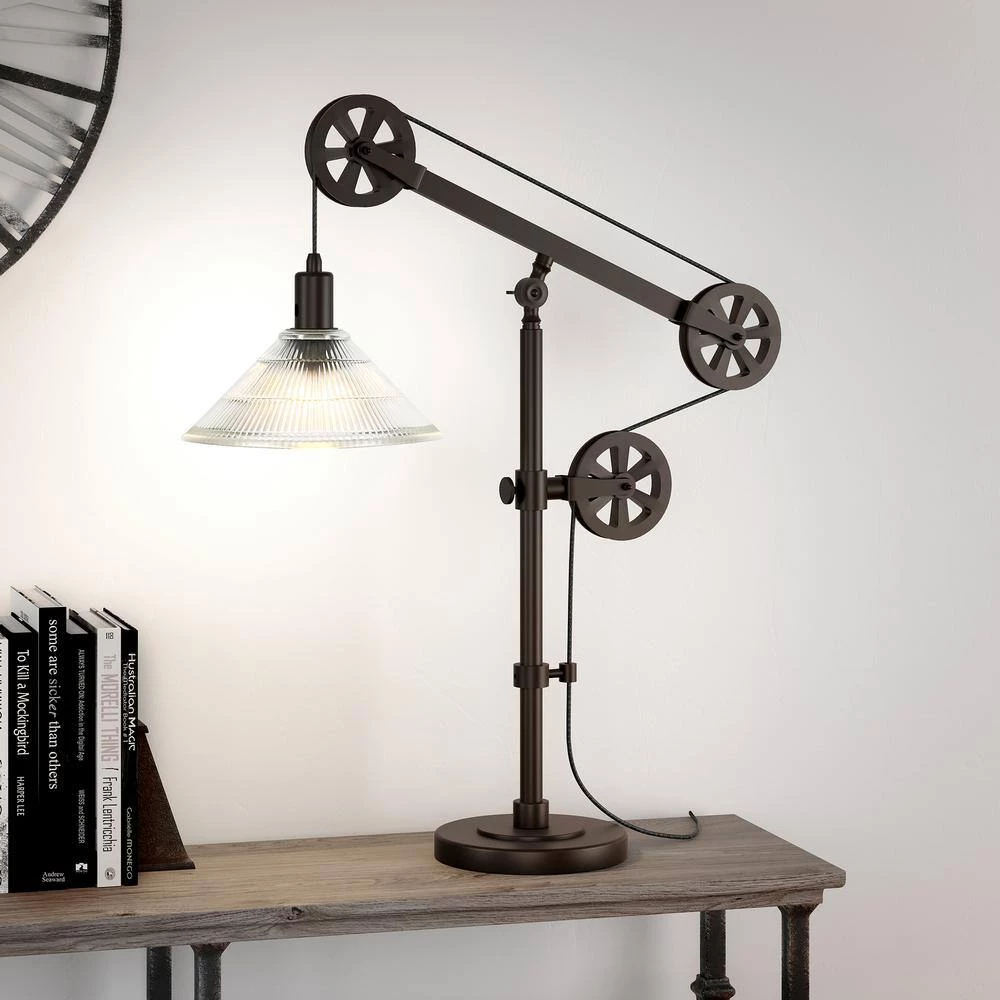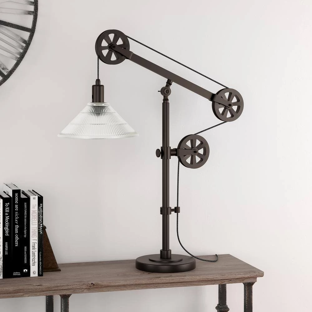 This blackened bronze table lamp counterbalances function and design. It features an adjustable pulley system allowing you to personalize your space. The ribbed glass shade softens the look allowing it to work in a variety of spaces.