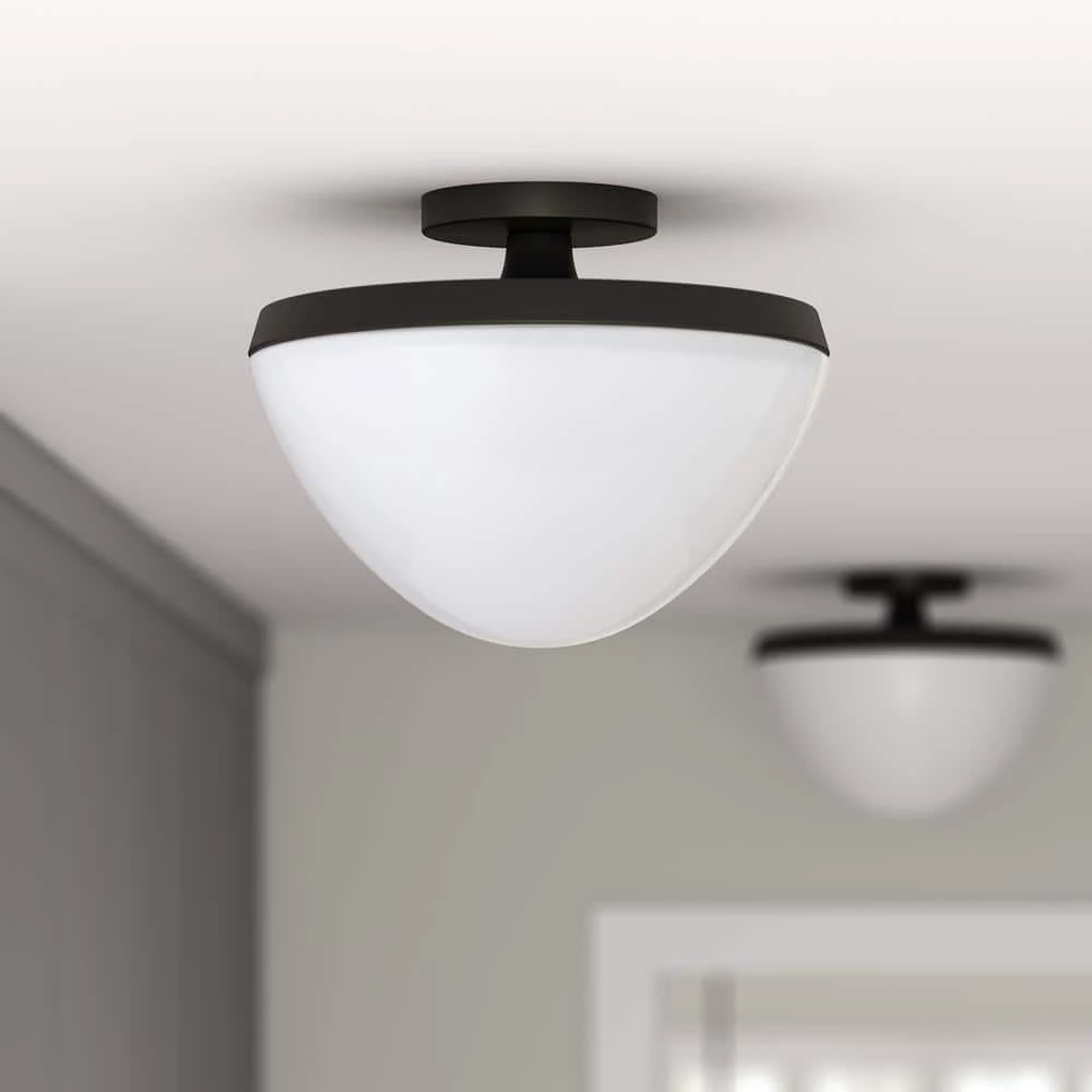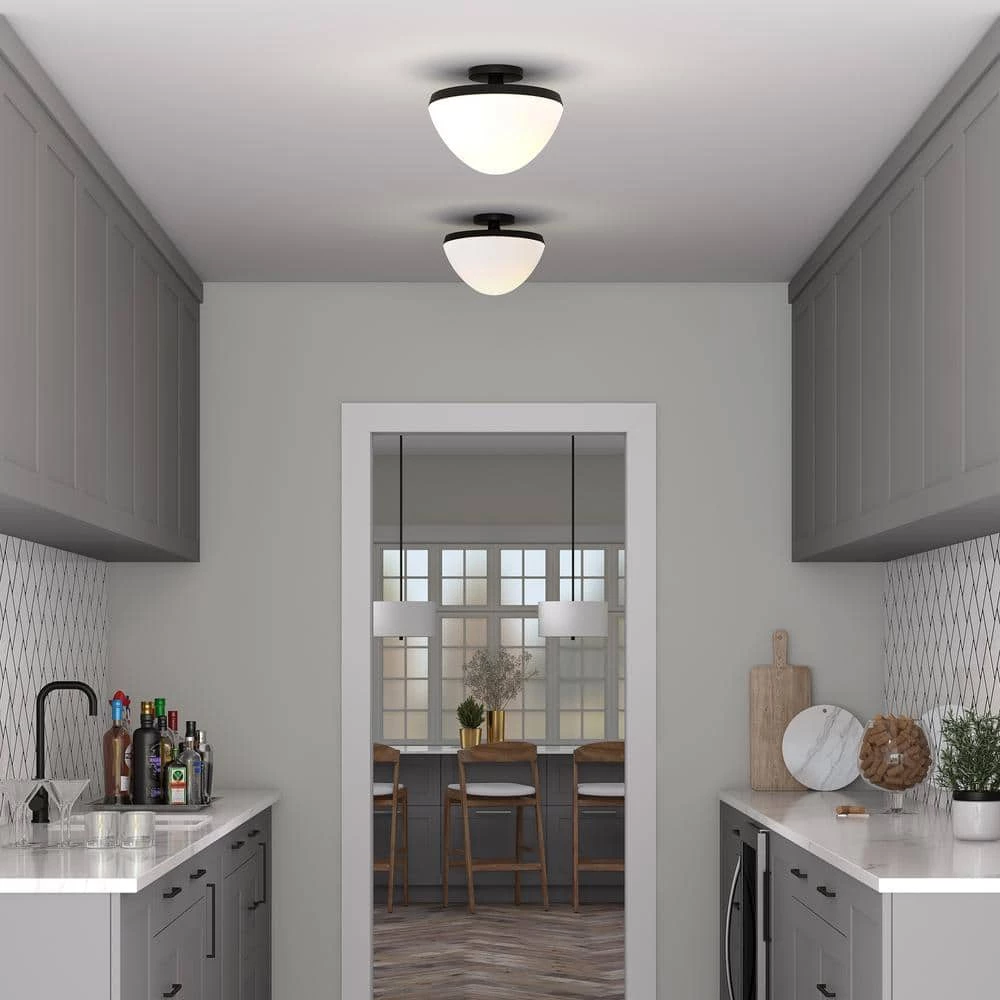 Pairing a modern canopy with an Art Deco-inspired body, this semi flush mount ceiling light creates an updated mid-century look in your entranceway, hallway, or dining room. The perfectly paired metallic accents coordinate with any color scheme, while the white milk glass domed shade casts beautifully diffused ambient light. This fixture will add effortless retro styling in any room of your home.