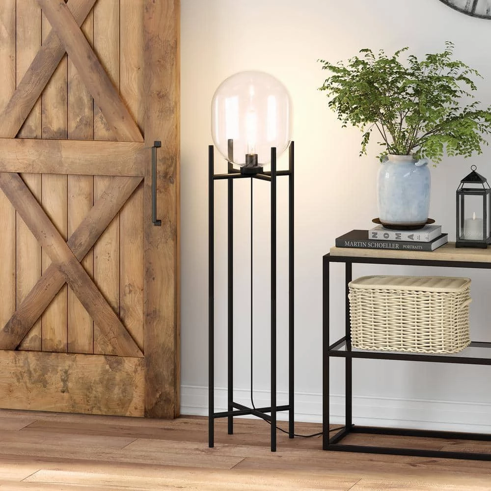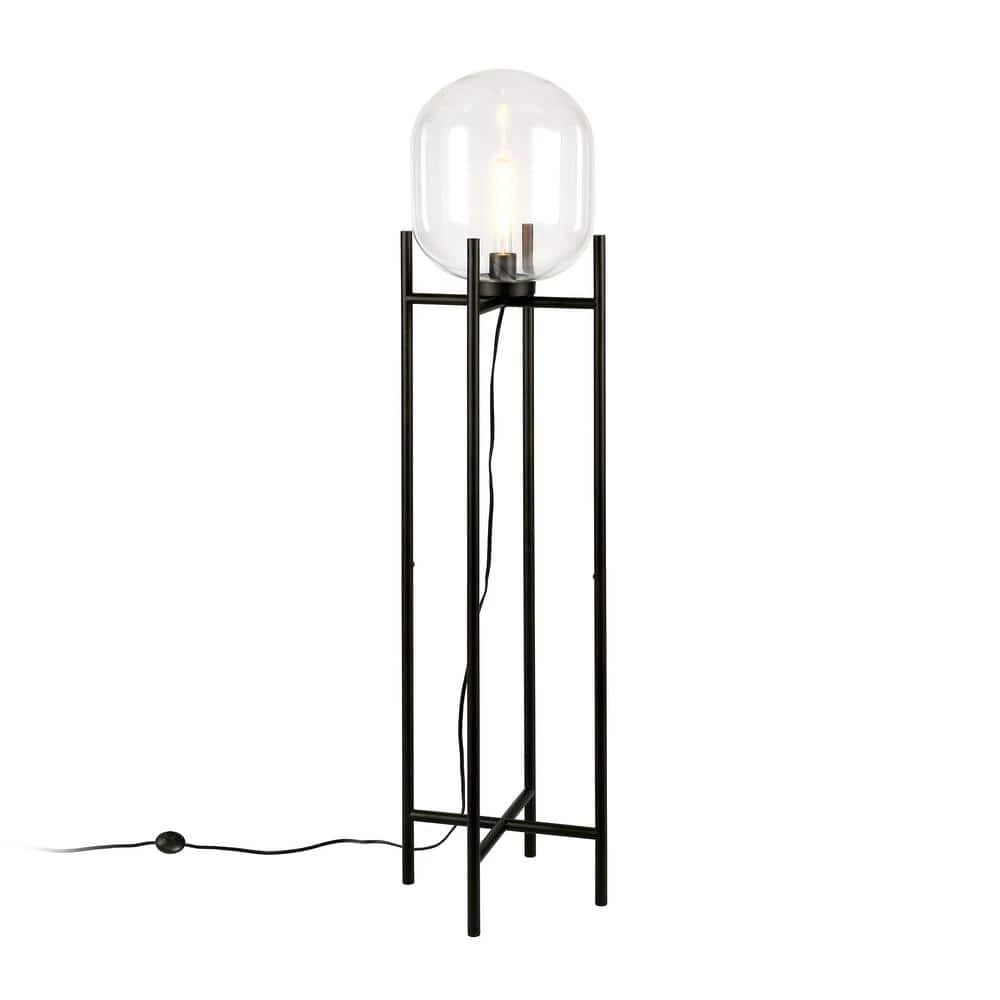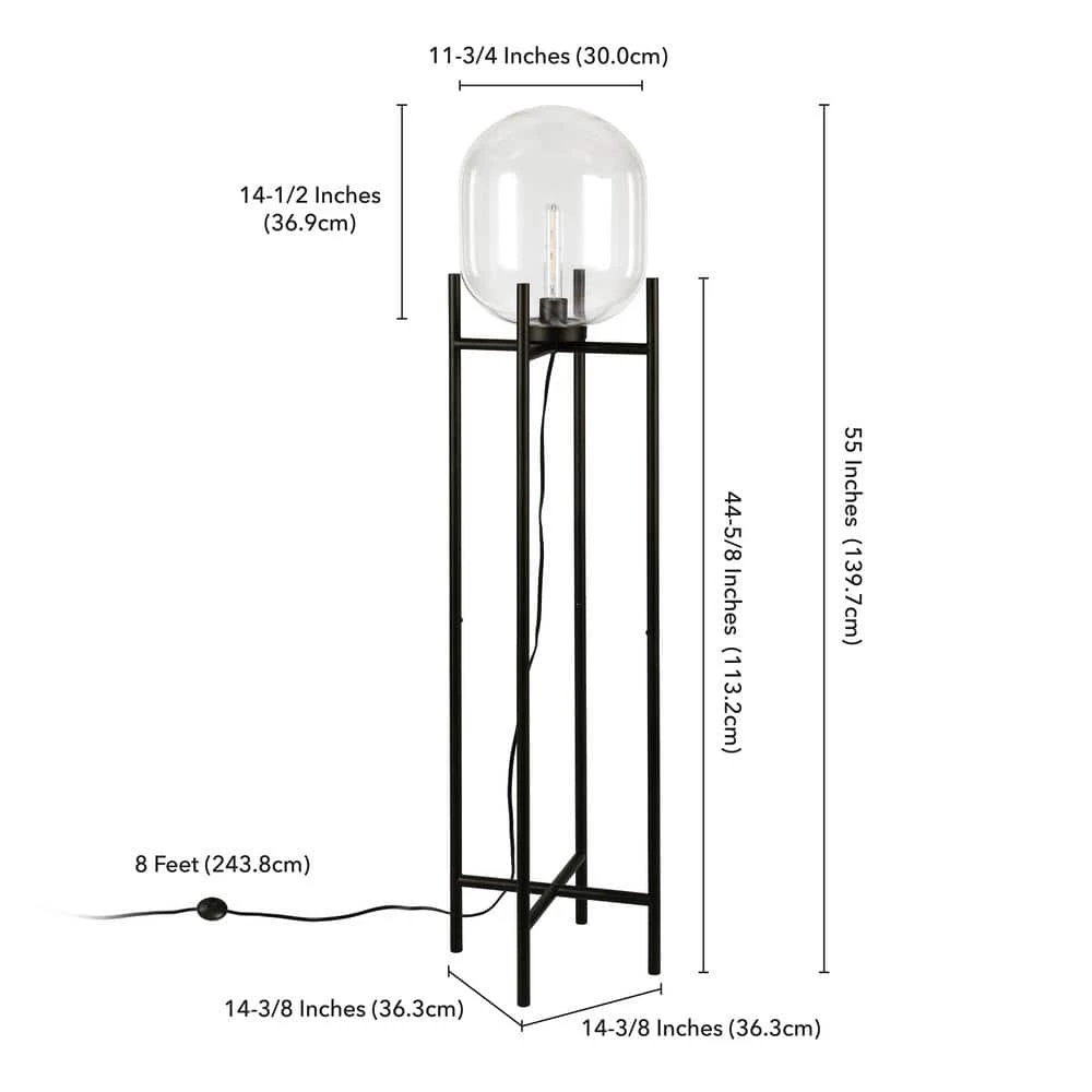 Both distinctive and refined, this unique floor lamp is the perfect complement to your modern living room or den ensemble. Featuring an eye-catching blackened bronze frame with a clear glass shade exposing the light bulb (not included). This is the standing lamp to make a statement with.