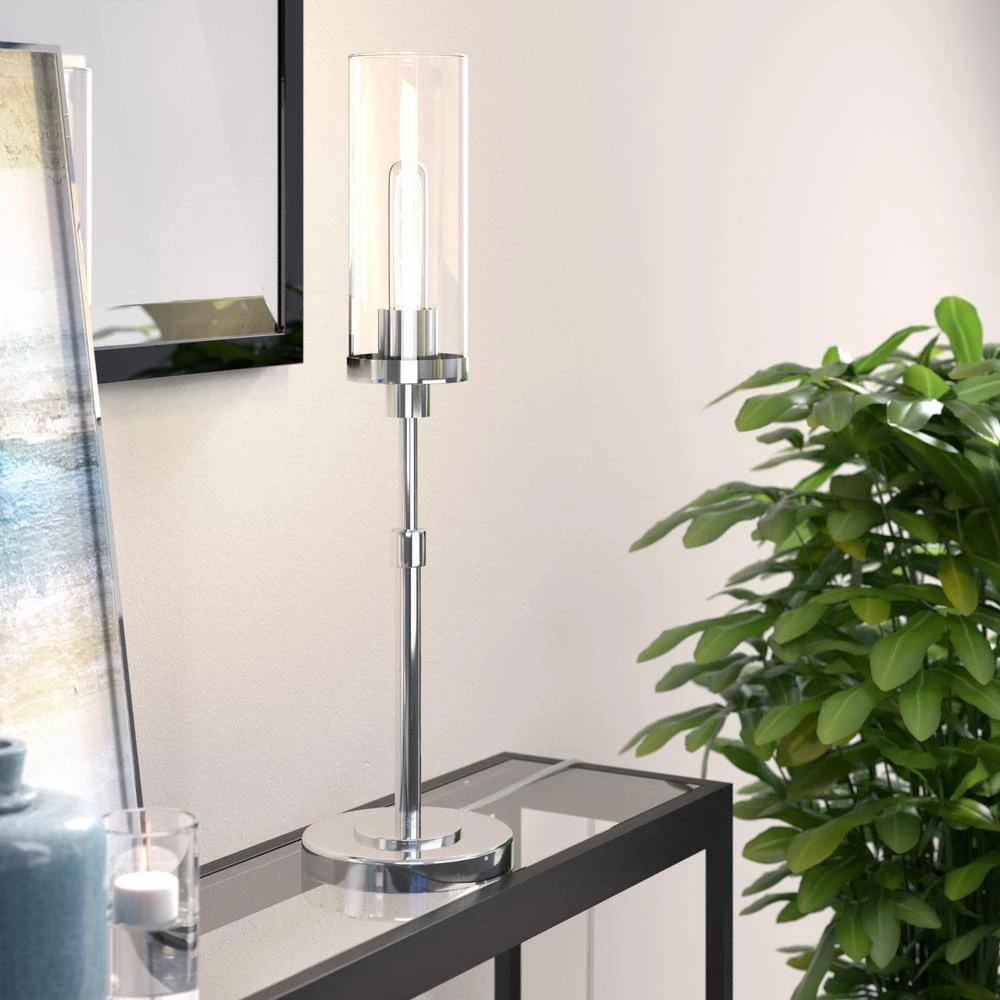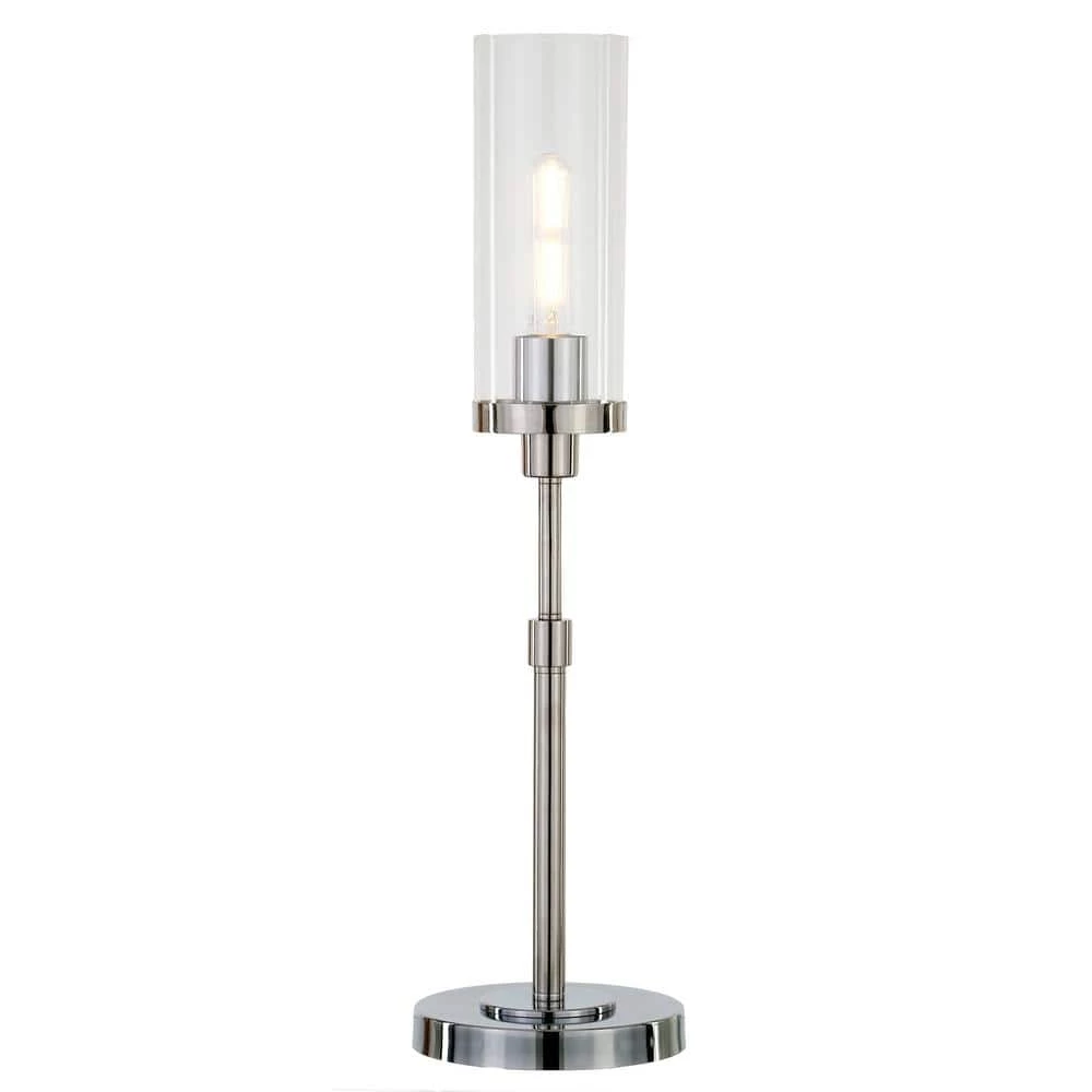 Bring a touch of modern sophistication to your dining table, mantel or sofa table with this decorative buffet-style lamp. Neutral metallic finishes are offset by a cylindrical glass shade. Their elongated candlestick base and torchiere glass shade offers sleek minimalist lines to offset your photo collection, decorative objects or next holiday meal.