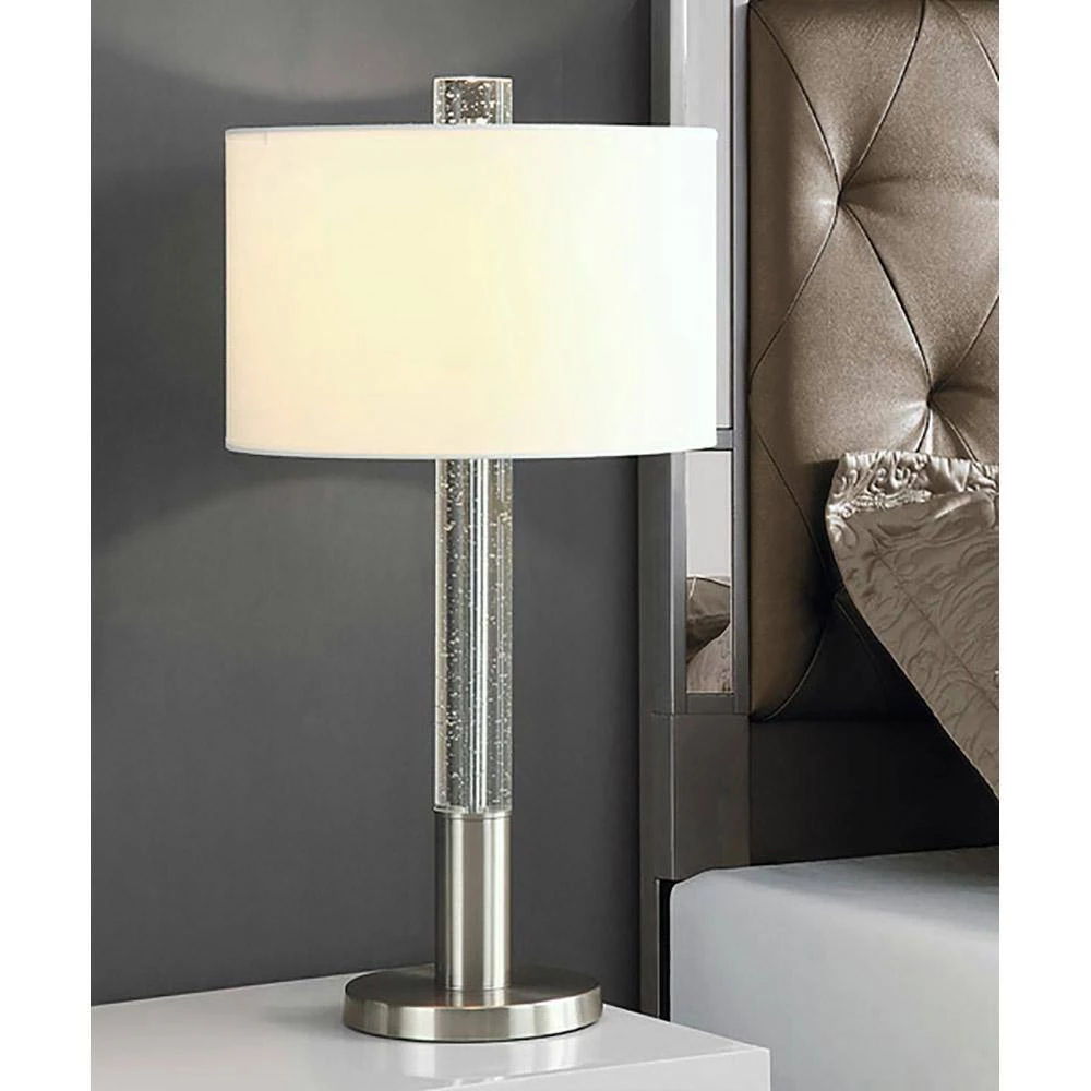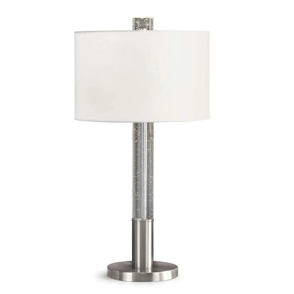 HOMEGLAM design, The FUSION lamps feature with heavy solid bubble crystal glass lamp column design. The 30 in. H table lamp made in brushed nickel finish strong metal and steady weight lamp base. The lamp come with15 in. drum white linen lamp shade, the light is controlled with socket rotary 3-way switch. The FUSION collection lamp from HOMEGLAM brings a simple, solid and stylish illuminating effect perfect fits your simple and contemporary spaces.