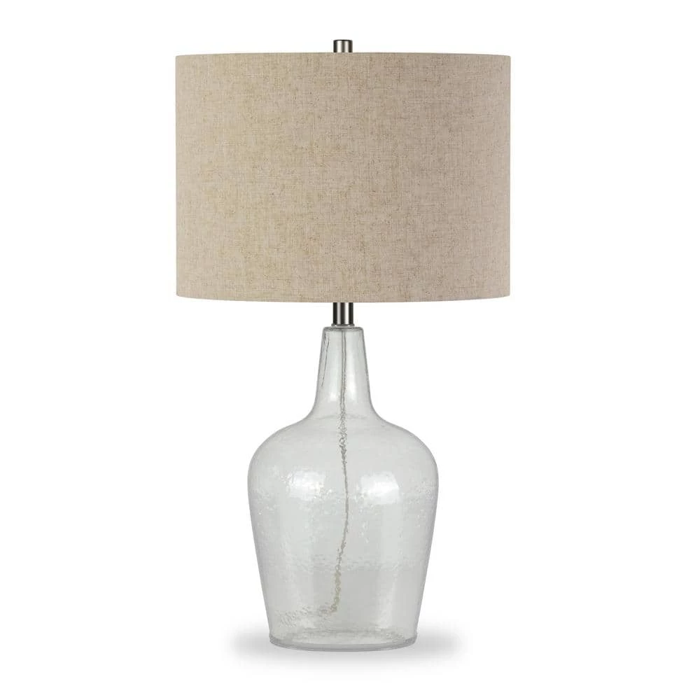 The open, clear glass base of this lamp allows for the option of using it as a makeshift cloche for small treasures and mementos, allowing you to customize it specifically to your space. On its own, however, the watermarked glass has an elegant but weathered finish, calling to mind a floating message in a bottle. A coastal flax textured shade completes the look.