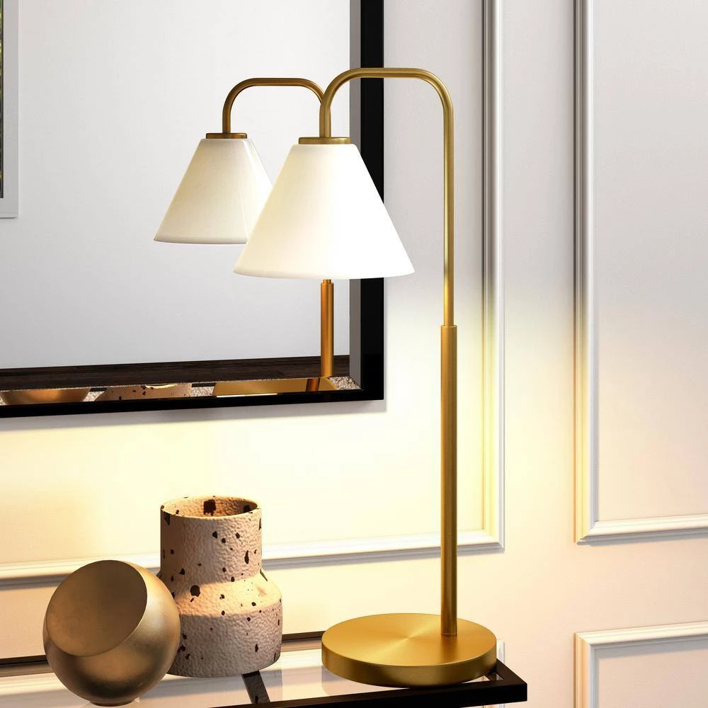 Bring a touch of modern elegance to your living room or bedroom with this eye-catching minimalist table lamp. The arc of the lamp leads to a cone-shaped glass shade that adds sophistication and warm lines to the design of your home. Let this lamp’s appealing blend of curves and angles illuminate your space in style.