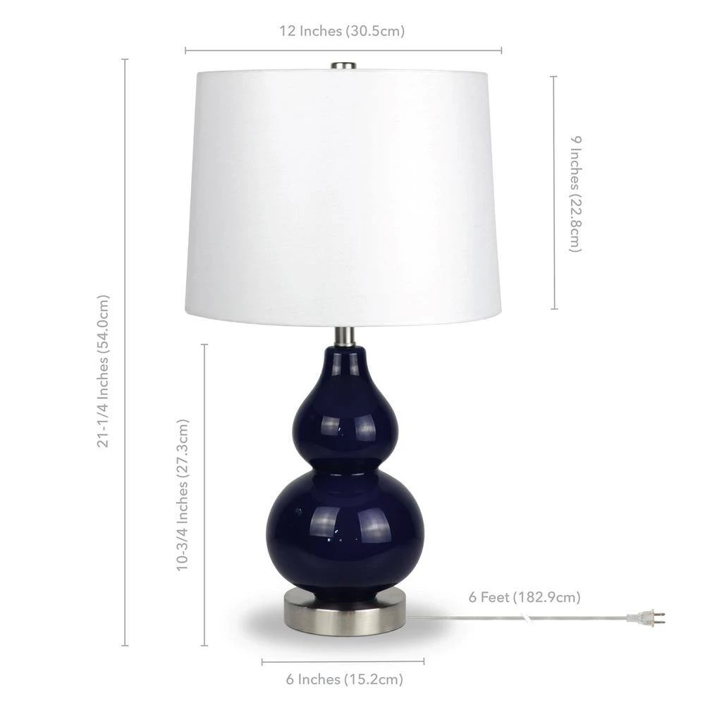 This lamp is a petite version of the beautiful and iconic double gourd lamp. Its base is crafted of glass finished in a glossy solid hue. Its single bulb is highlighted by a linen French drum shade in a crisp chiffon color.