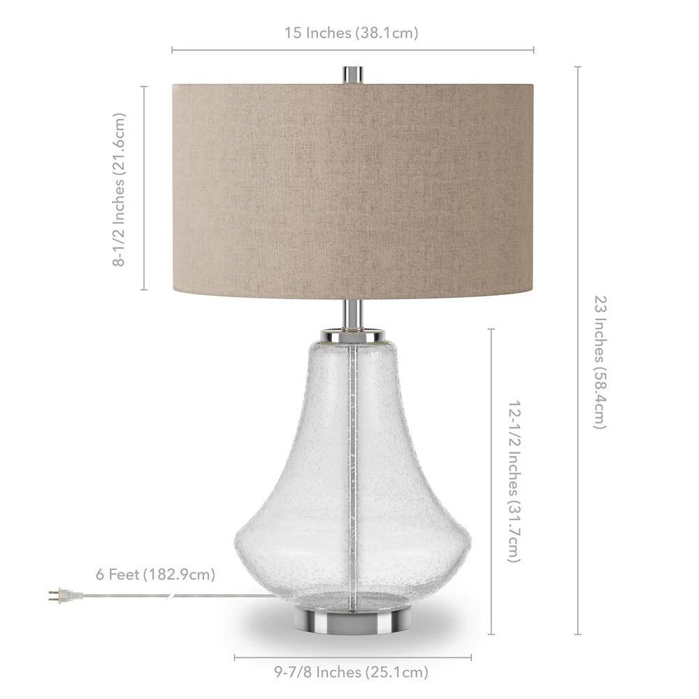 This table lamp combines natural elements of the seeded glass body and linen shade for an elegant organic feel. Its French drum shade allows for it to be a classic look in any room. Its neutral color shade makes a soft touch for any space.