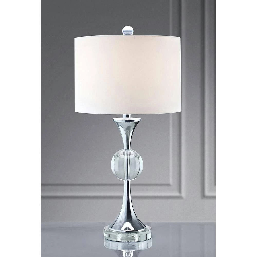 - Chrome finish metal construction with crystal glass round trim lamp base
