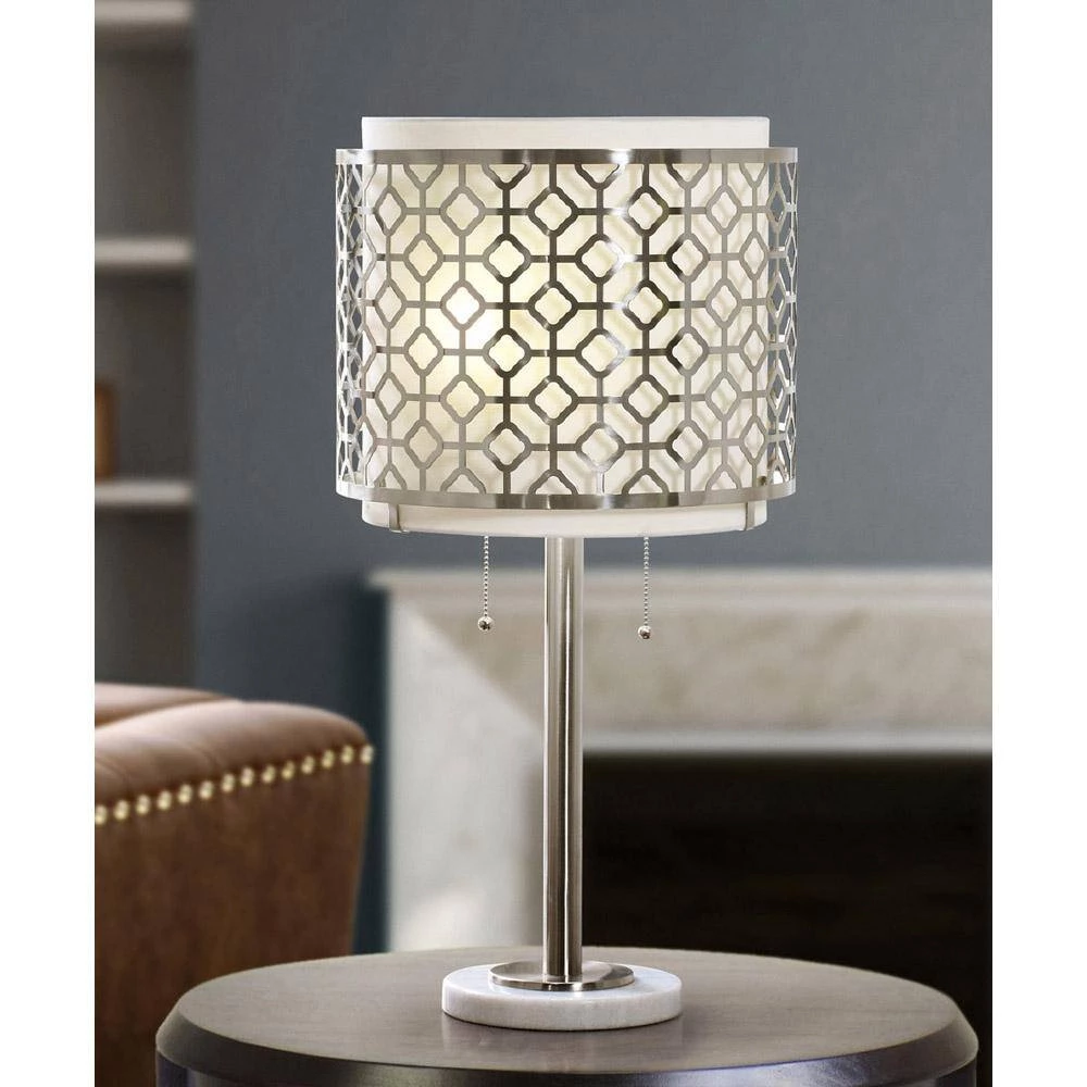 - Brushed nickel finish metal construction with weighted marble lamp base