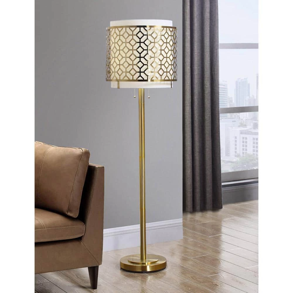 HomeGlam Design, The Melrose collection features laser engraved beautiful design pattern metal lamp shade and also with a white linen inner shade. The lamp is built with strong metals and steady heavy weighted lamp base. The 2 lights floor lamp is controlled by 2 chain on/off switch. The Melrose lamp collection from HomeGlam brings perfect looks to where you want a simple, modern and luxury of light display.
