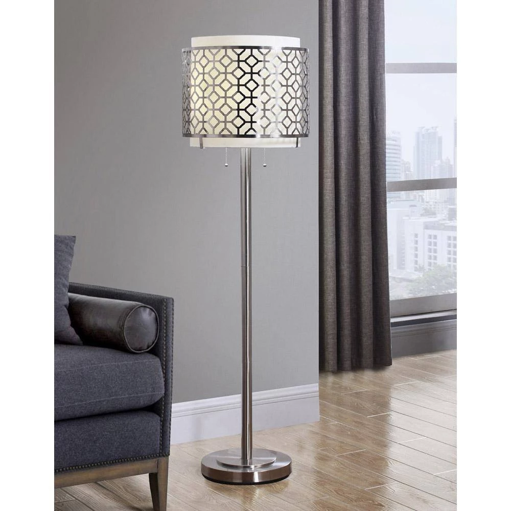 HomeGlam Design, The Melrose collection features laser engraved beautiful design pattern metal lamp shade and also with a white linen inner shade. The lamp is built with strong metals and steady heavy weighted lamp base. The 2 lights floor lamp is controlled by 2 chain on/off switch. The Melrose lamp collection from HomeGlam brings perfect looks to where you want a simple, modern and luxury of light display.