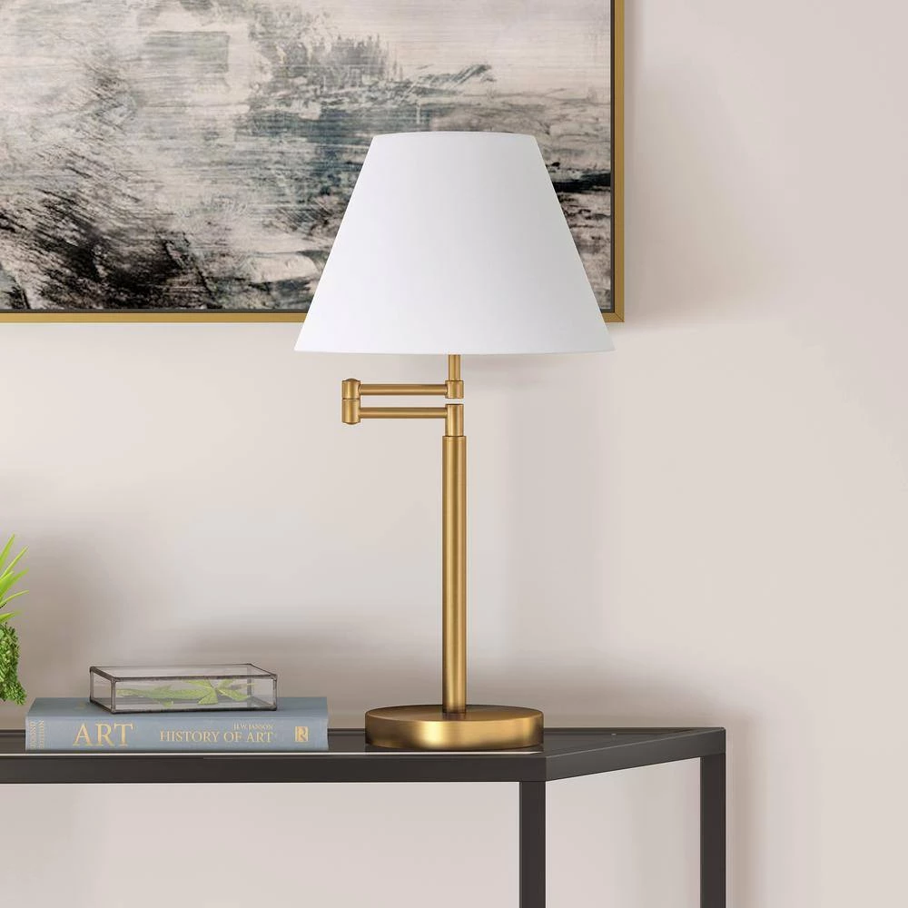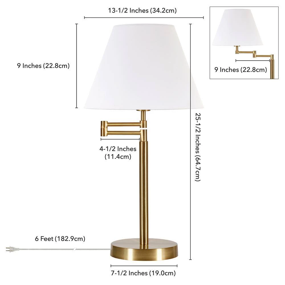 Combining a contemporary feel with streamlined modern design, this table lamp is the perfect addition to your living room, office, or bedroom ensemble. The warm neutral metallic finishes complement many decor styles and color schemes. It features a swing arm that allows easy movement of light around your reading nook or workspace.