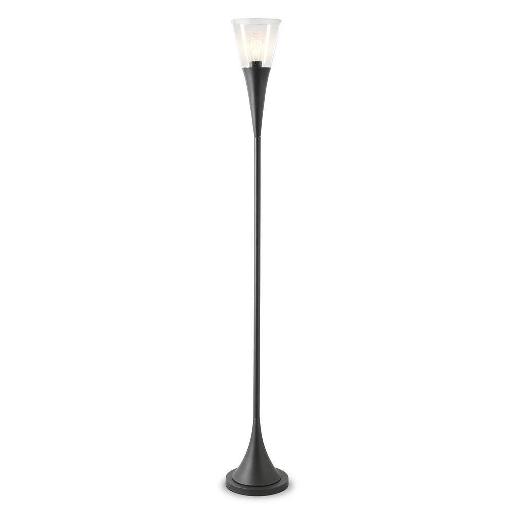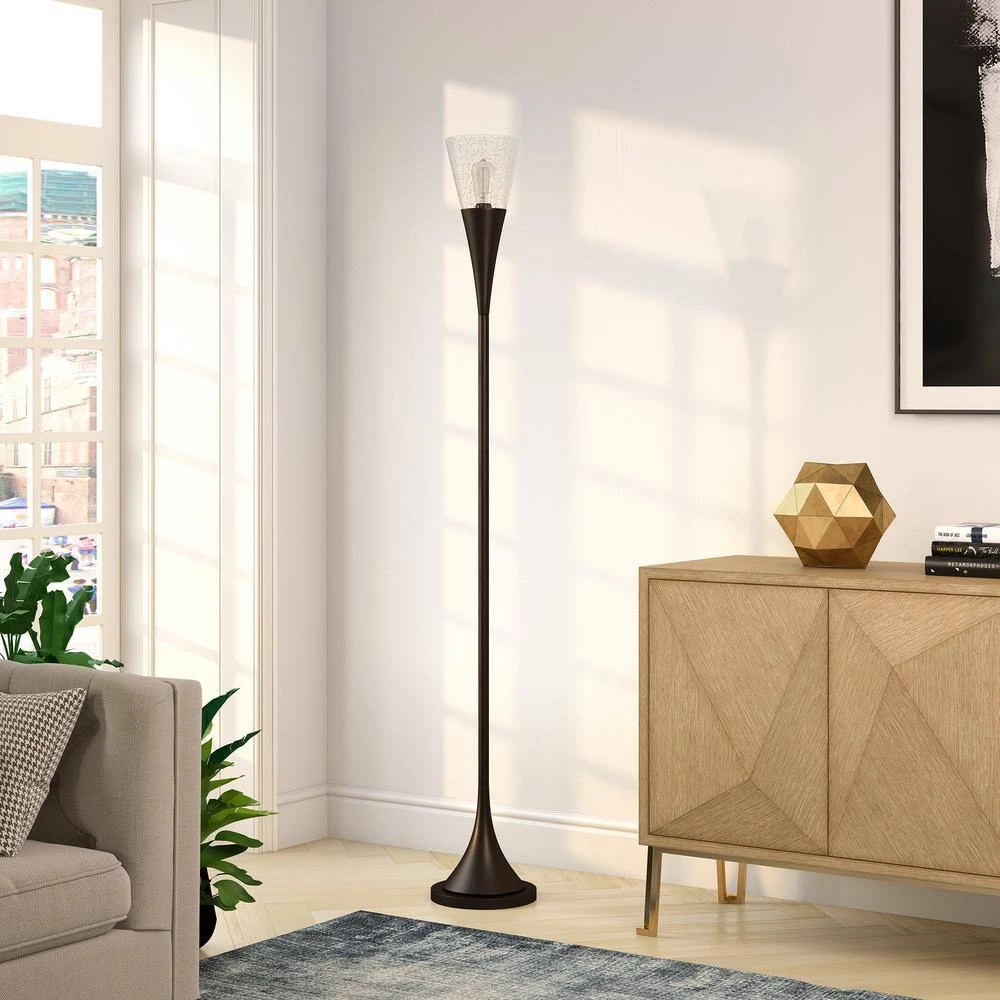 This blackened bronze table lamp combines the natural elements of a seeded glass shade in a delicate inverted cone shape for a clean but organic aesthetic. The blackened bronze finish blends seamlessly with any color scheme. The torchiere shape adds refinement to any space.