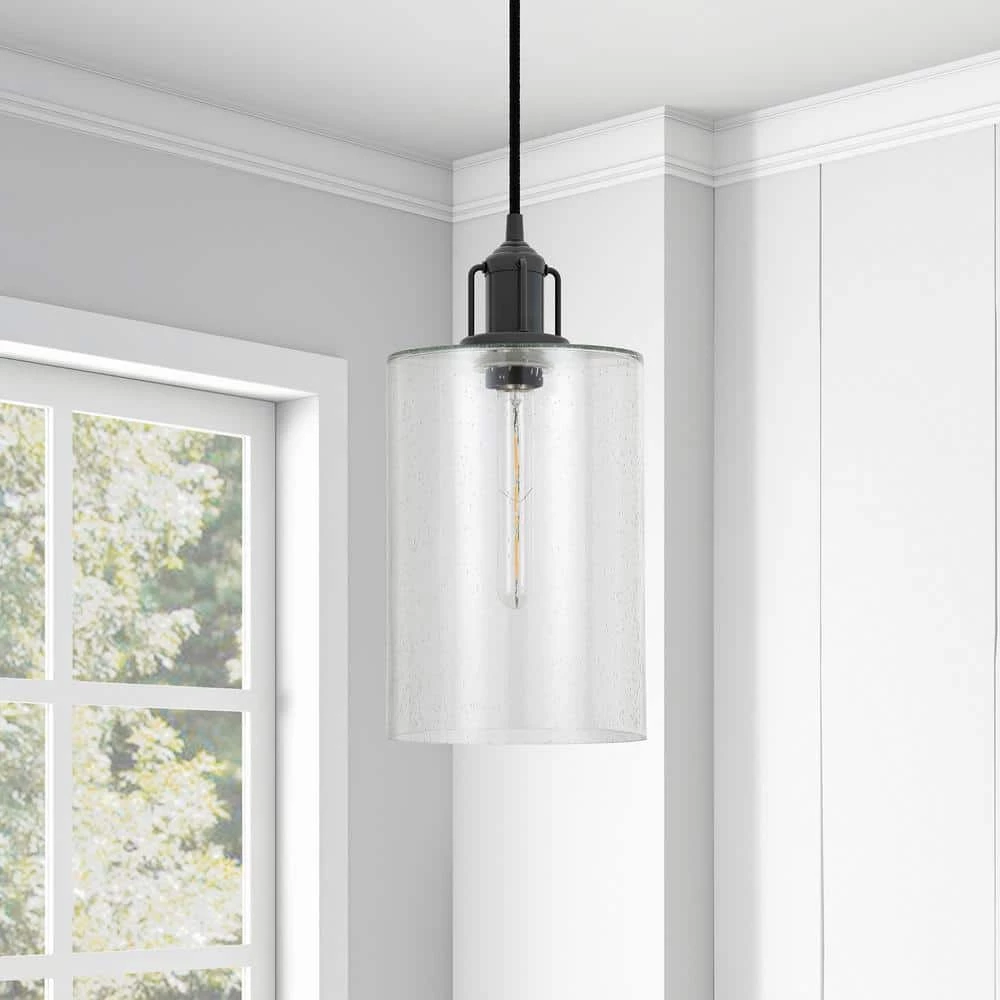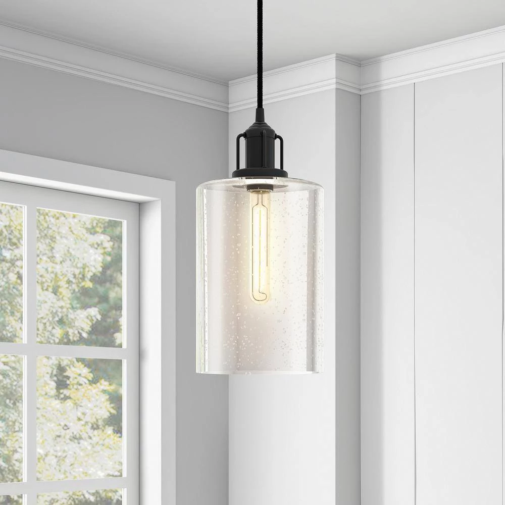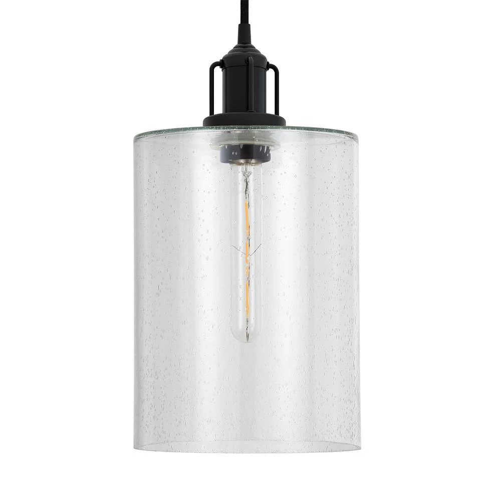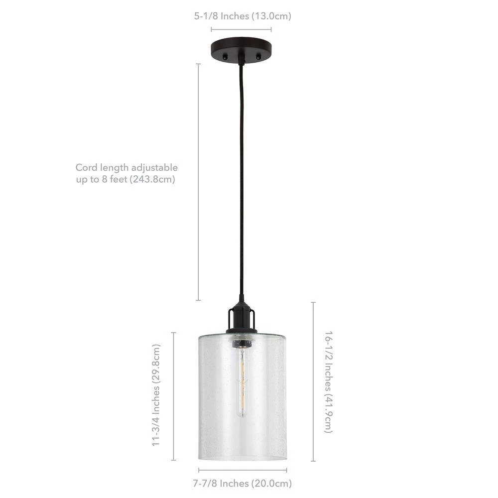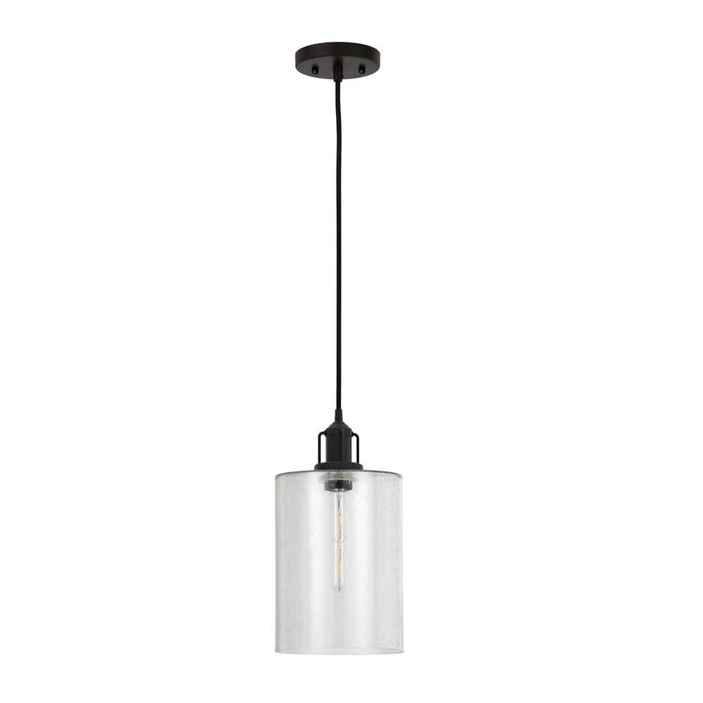 With a style inspired by the industrial revolution but appropriate for a coastal beach house, this pendant brings true mood lighting to your space. The seeded glass provides an antiqued look that complements the blackened bronze hardware and cylindrical shade. Pair it with an Edison bulb for a classic retro vibe.