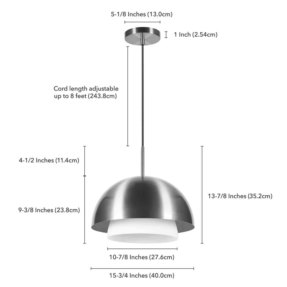 Suspended from a hanging fixture, this pendant light is perfect for illuminating your entryway, dining room or kitchen island. Contemporary, modern design is amplified by a sleek metallic finish that extends into a bowl-shaped exterior shade. An interior white frosted glass shade add a layer of visual interest and focuses the light downward.