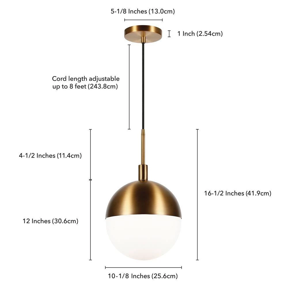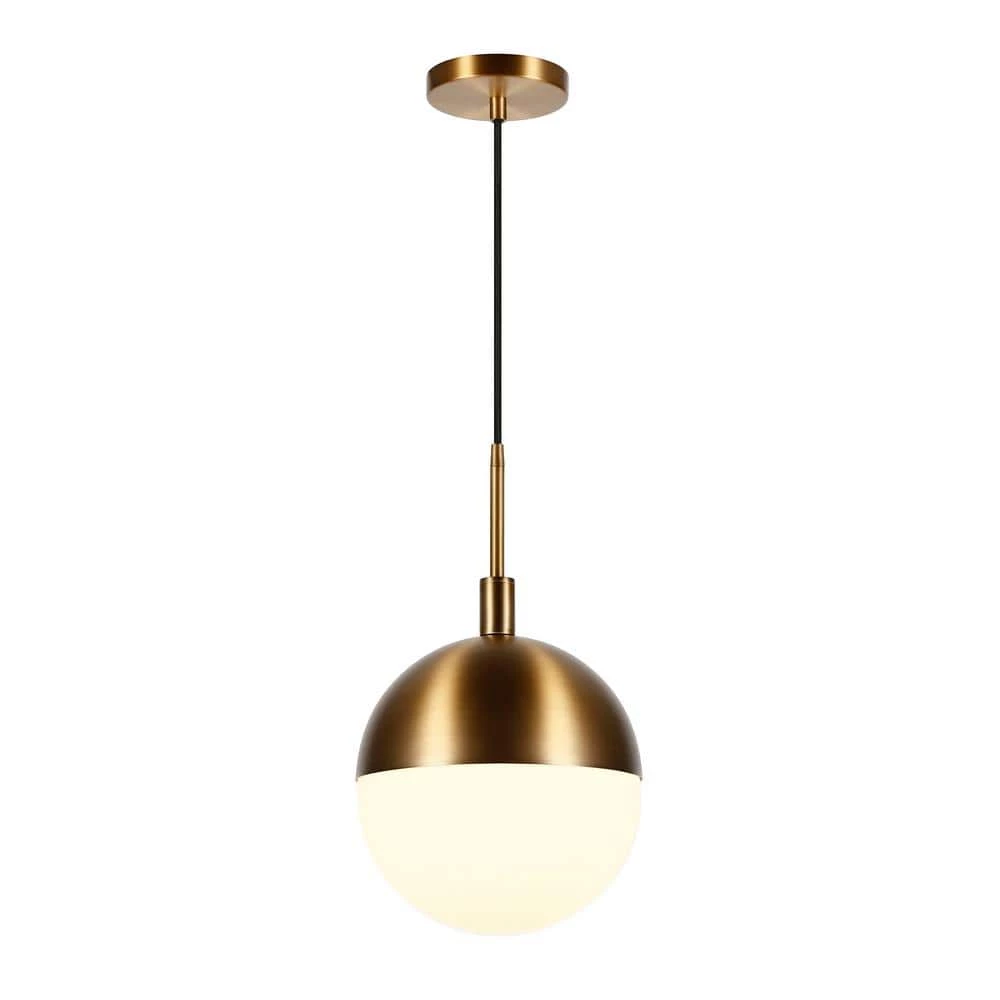 This globe-shaped pendant is made from metal and frosted white glass creating a cozy, modern feel for your kitchen, entryway or dining room. Hanging from an 8 in. black weave cord with metal hardware finished in a warm brass tones, this is the ultimate pendant light to complete your living space.