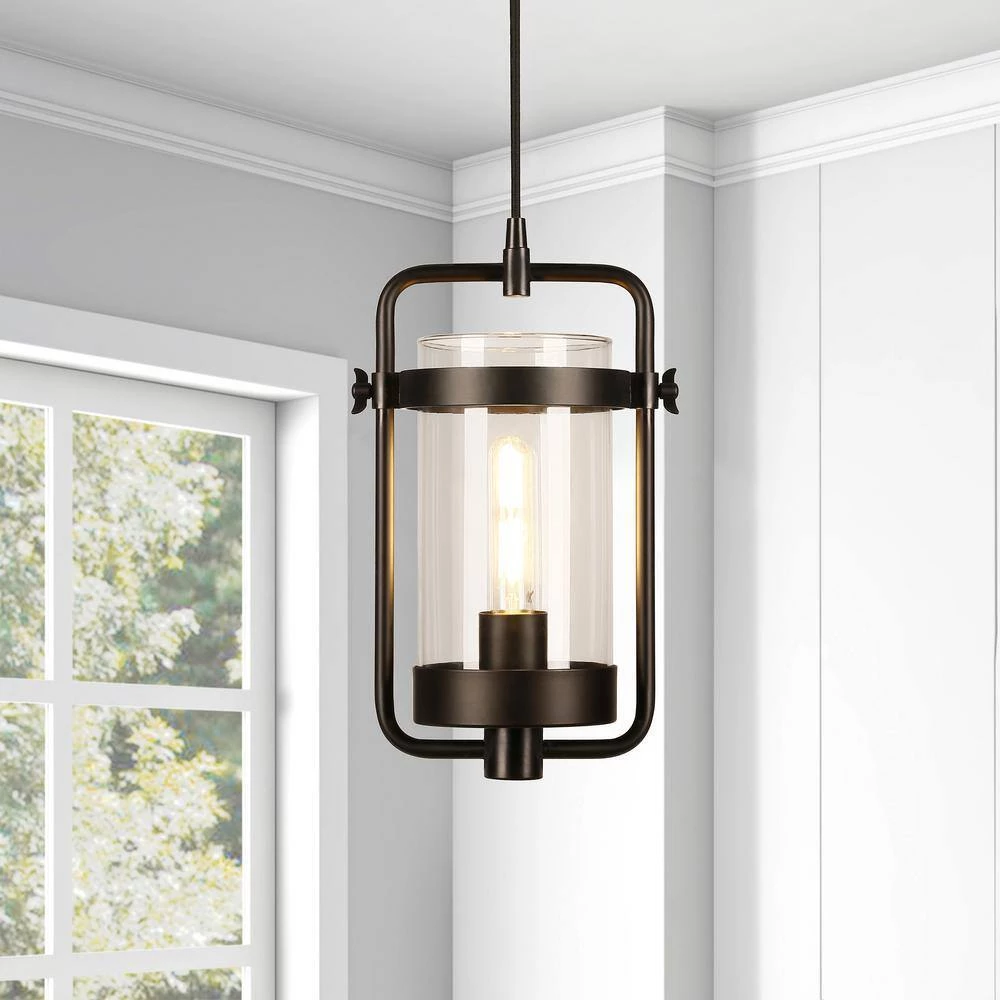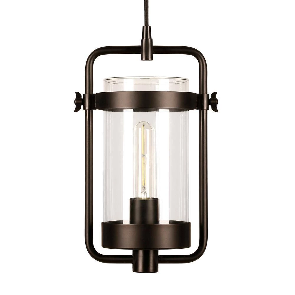 This hanging pendant light combines blackened bronze hardware with a clear glass body for a sleep industrial design. Simple yet chic, this fixture lights small to large spaces with ease. This pendant will be the centerpiece of any room.