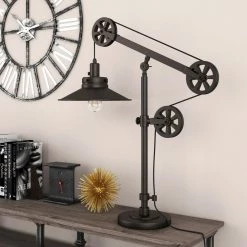 Fusing function and industrial style, this standing lamp is the statement piece you need in your living room or bedroom. It features an industrial-inspired pulley system so you can adjust its height to suit your task. Crafted from metal with a blackened bronze finish, this floor lamp is perfect for a modern-inspired space. A dome-shaped shade completes the look for your office or bedroom ensemble.