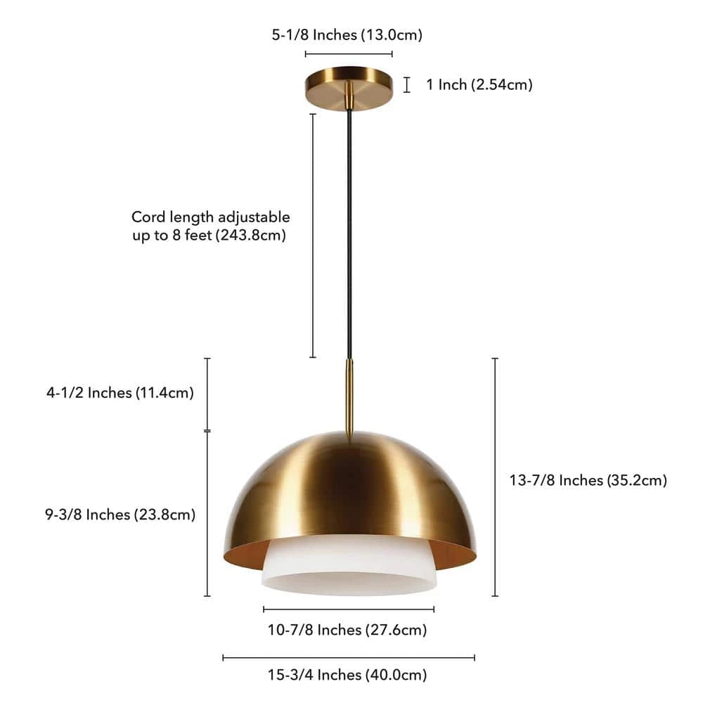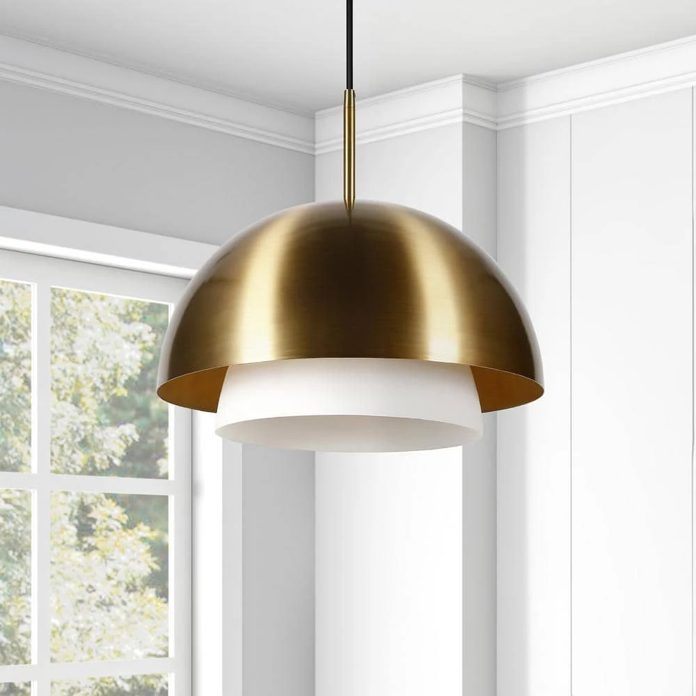 Suspended from a hanging fixture, this pendant light is perfect for illuminating your entryway, dining room or kitchen island. Contemporary, modern design is amplified by a sleek brass finish with an interior white frosted glass shade directing light downwards.
