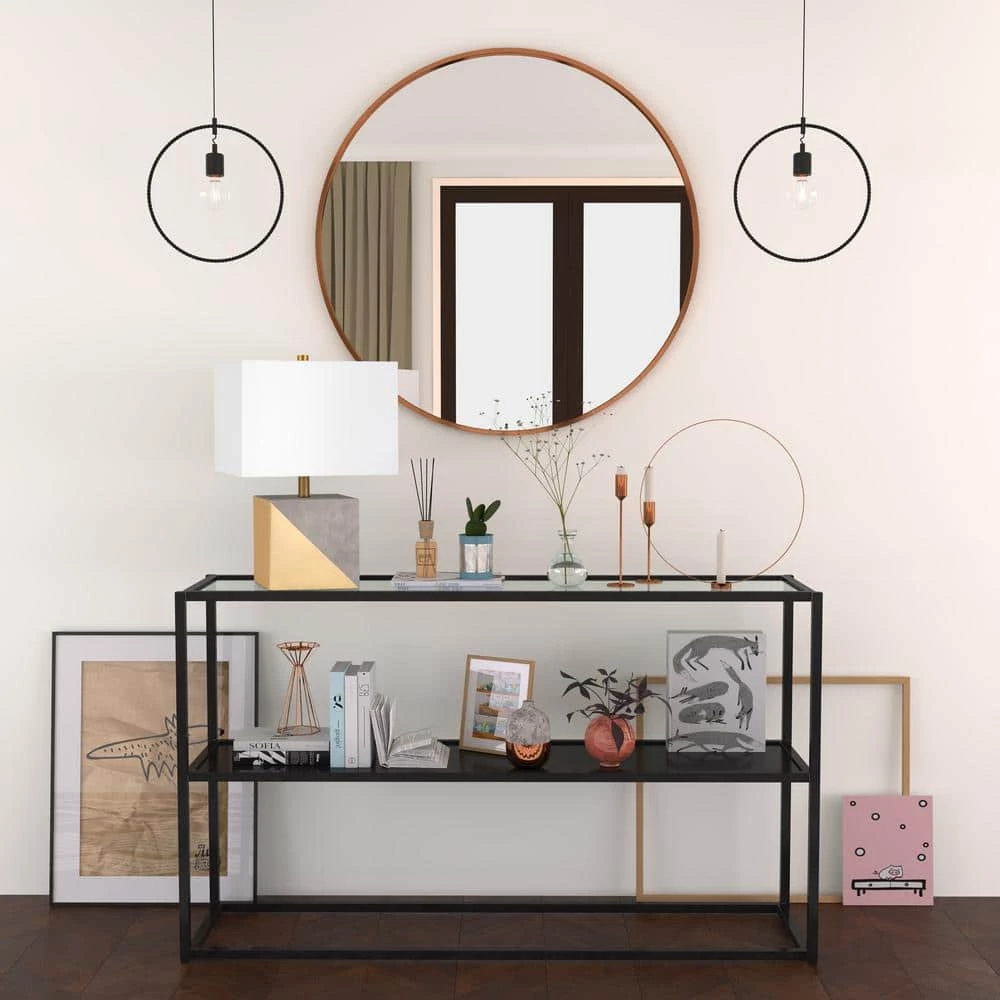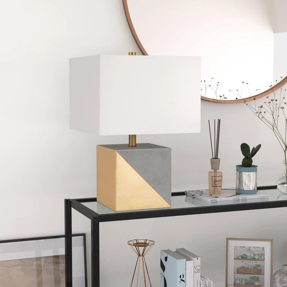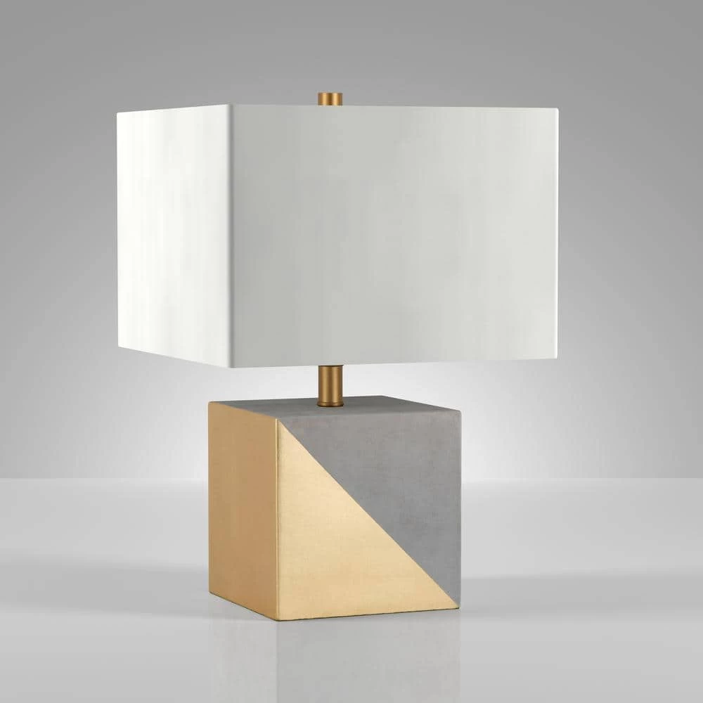 This table lamp creates a refined industrial look with its dipped gold concrete base. This gold base allows for a glam look in any room. It is paired with a French drum shade.