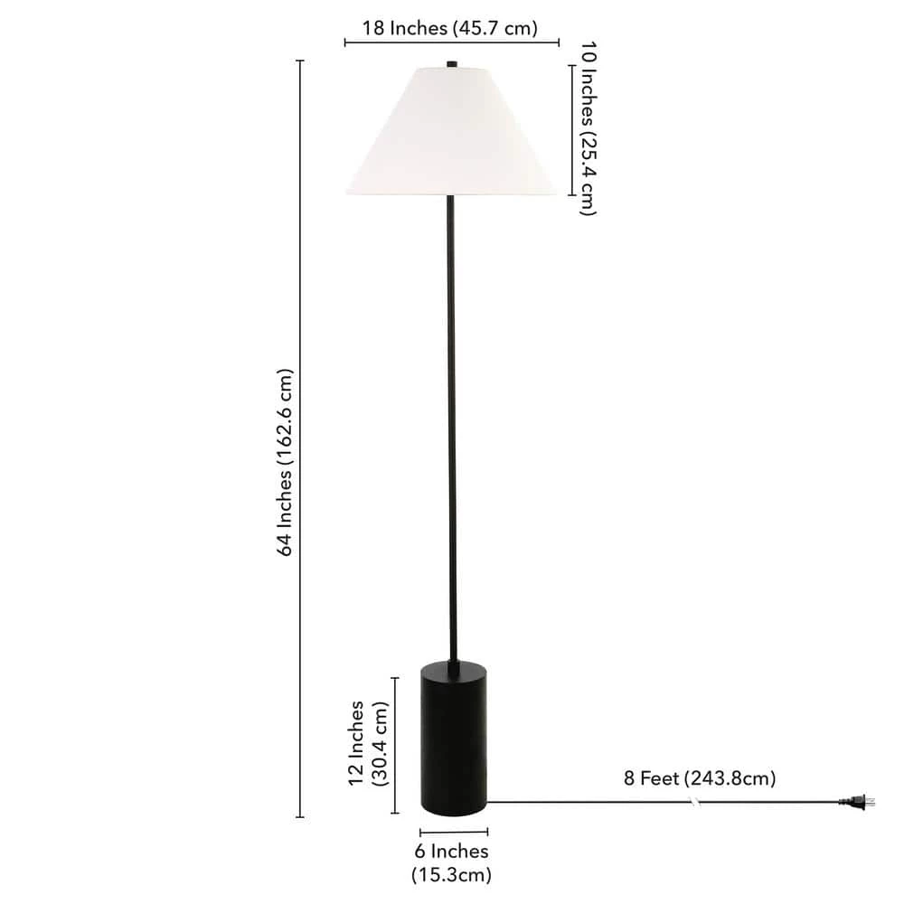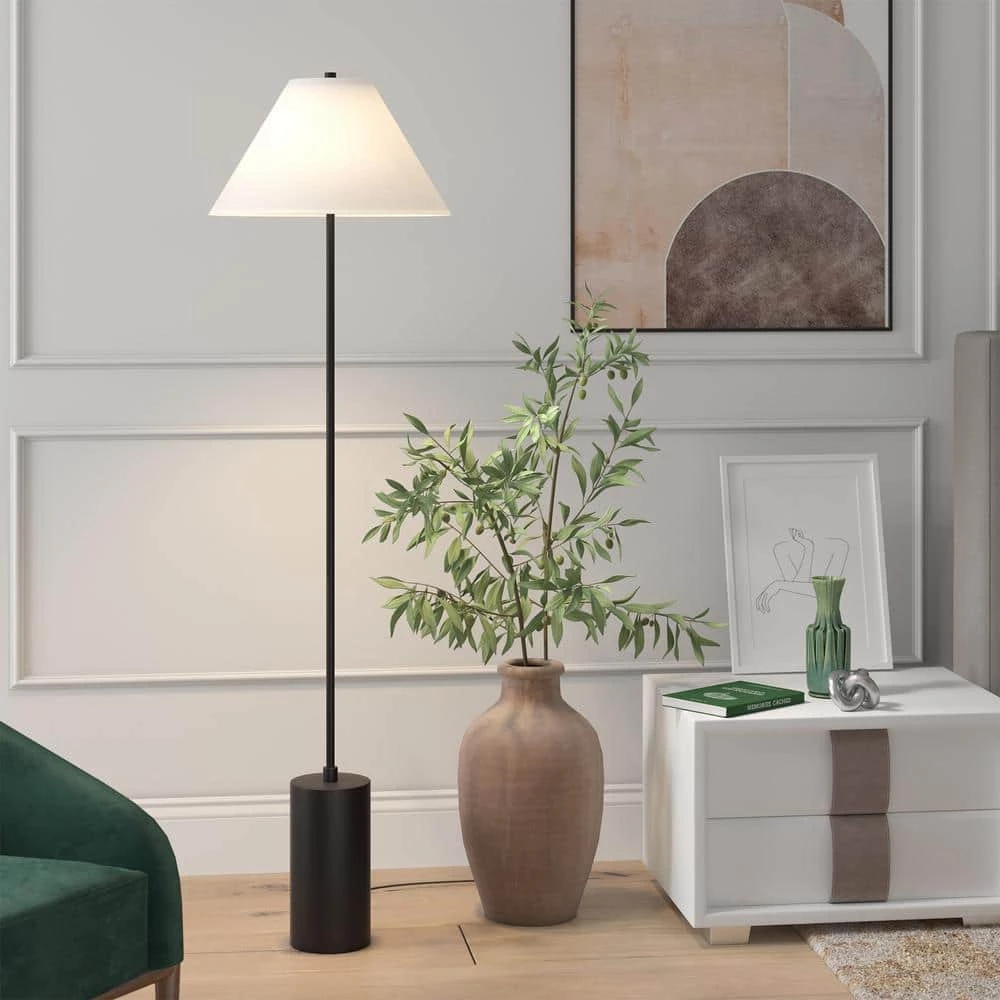 This contemporary floor lamp features a slender metal rod that extends upward from a cylindrical base crafted from steel and hand-finished in blackened bronze or golden brass. A linen shade sits at its top end, adding a crisp polished element while maintaining the minimal, circular aesthetic. This fixture is ideal for adding light and airy illumination in a bedroom, living room, or office space.