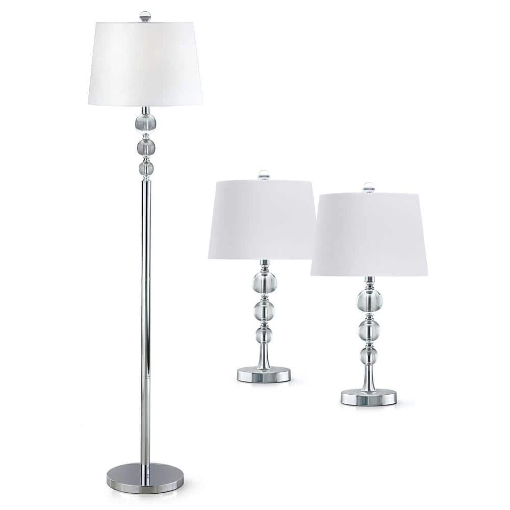HOIMEGLAM design, the Taranto lamp collection features 3 clear cut solid crystal balls design. The 3-pieces lamps set include one 61 in. H floor lamp and two 25 in. H table lamps. The lamps are build with strong metal construction and steady weighted lamp base in polished chrome finish. The lights are controlled with socket rotary on/off switch with empire style white linen lamp shades. The Taranto lamp collection from HOMEGLAM brings luxury and harmonize decor lights to your spaces.